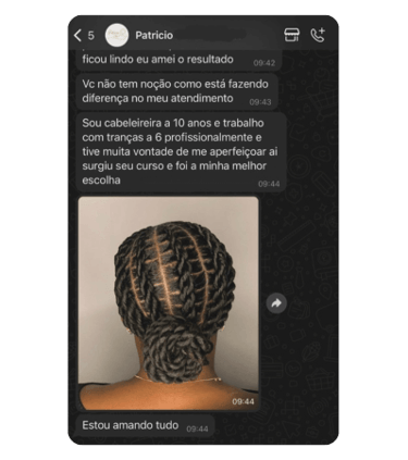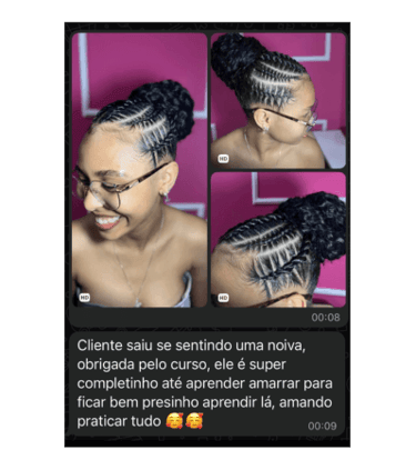 Atuando a + 10 anos na área, hoje ela é reconhecida pelos penteados sofisticados para eventos, a 5 anos ensina outras pessoas a viver desse área também, e agora em formato de curso on-line, passando todos os detalhes que faz a diferença, mergulhe nesse mundo também e conquiste seus sonhos através do seu trabalho, o curso foi montado com muito carinho em cada aula, “Meu número para suporte fica a disposição, qualquer coisa só dar um help, bons treinos”.